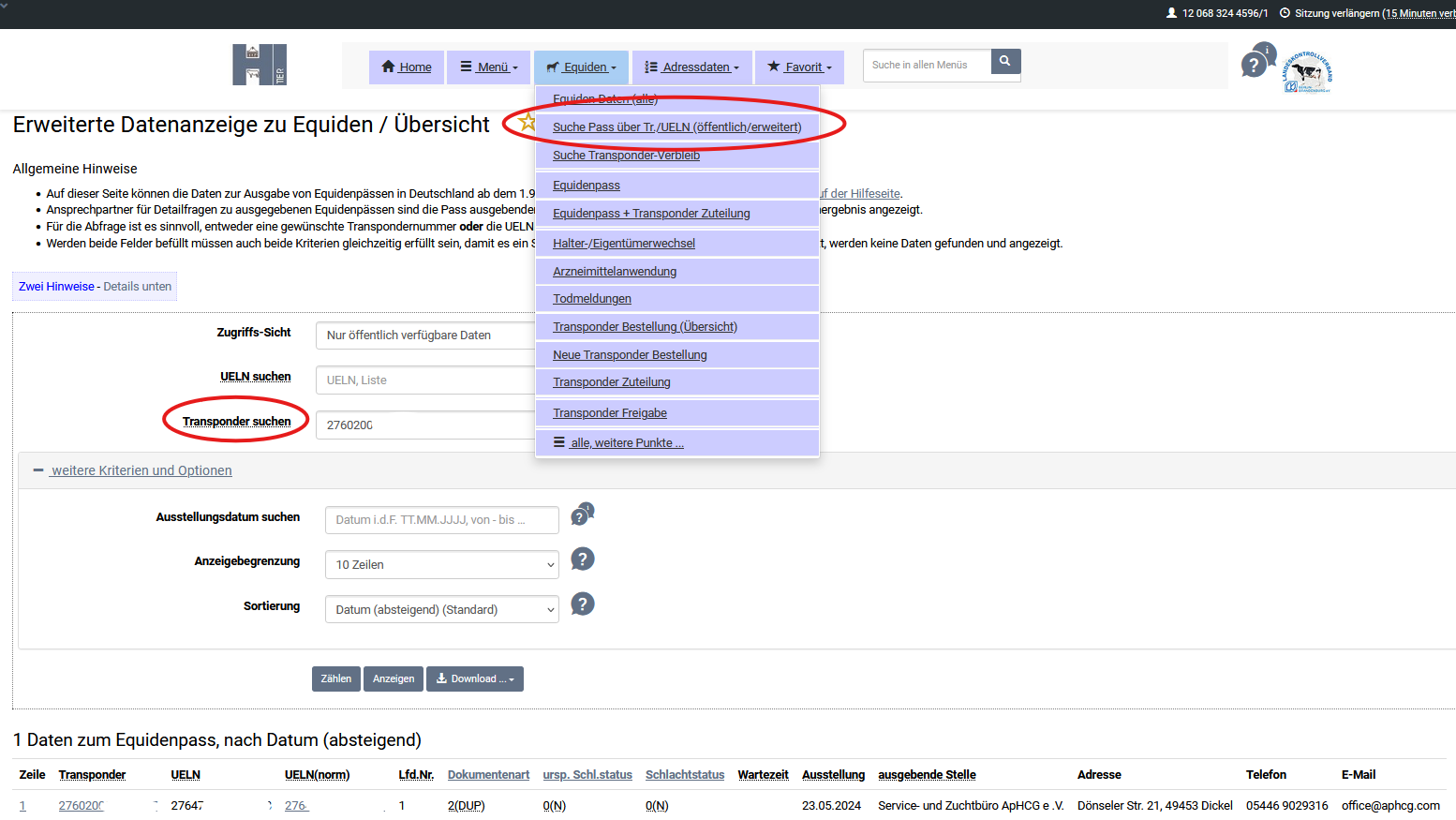 Hierfür muss im Feld Sichtweise 'Ansicht für Halter und Sonstige' ausgewählt werden. Bei Klick auf 'Anzeige' werden die Transponderzuteilungen angezeigt.