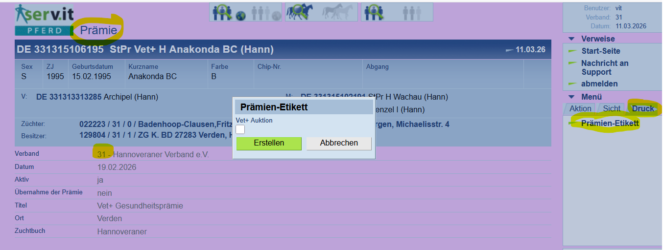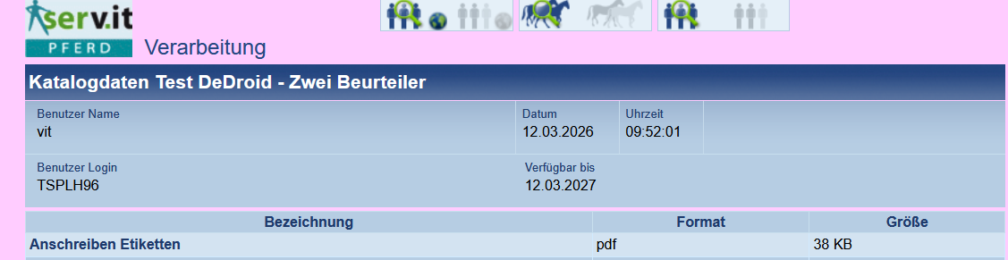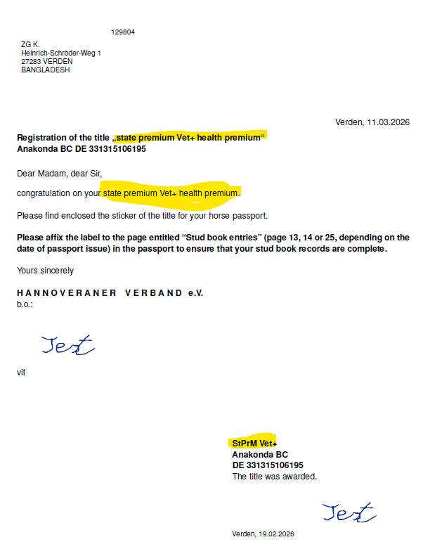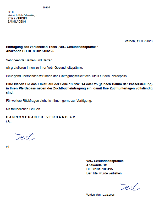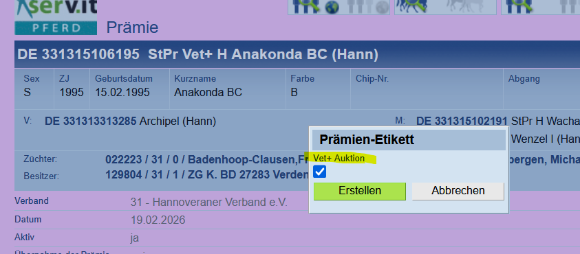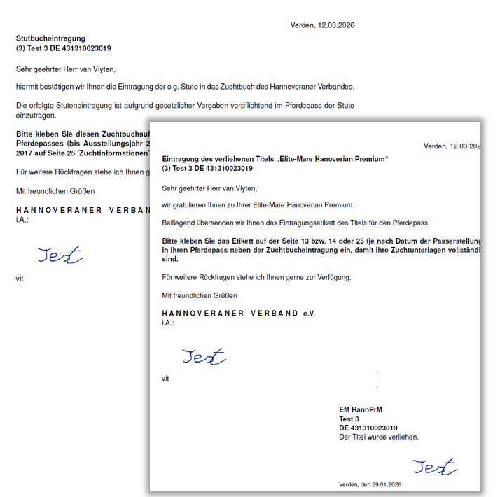 Für alle Stuten der Veranstaltung, die im Zeitraum der Veranstaltung eine Prämierung gespeichert haben, wird ein entsprechendes Anschreiben mit Etikett erstellt. Empfänger des Anschreibens ist der aktive Besitzer der Stute bzw. der Beschicker aus der Nennung.