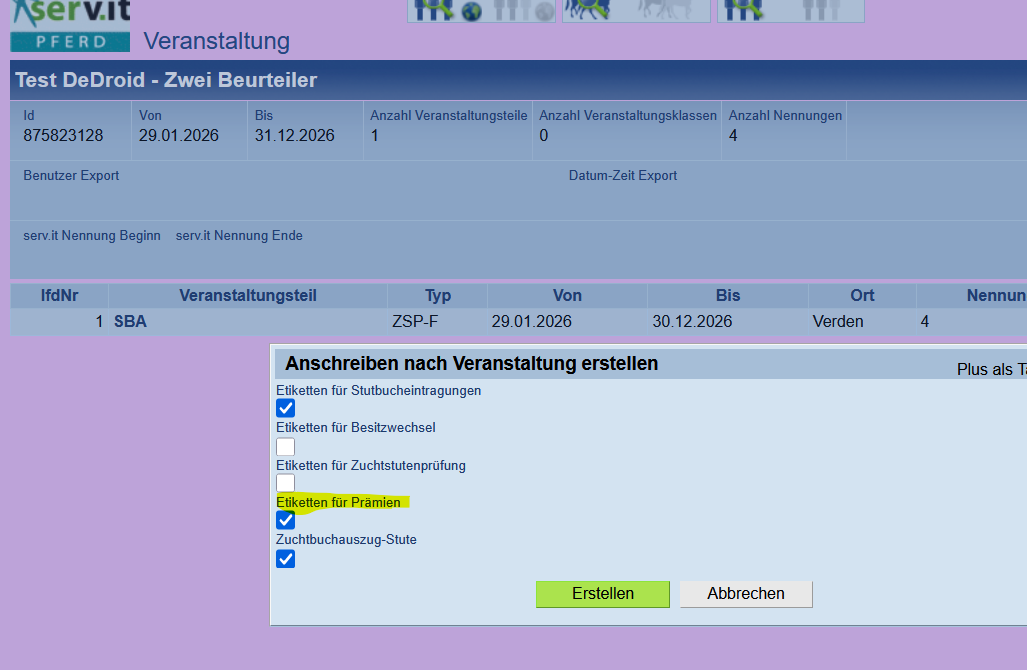 Im Rahmen einer Veranstaltung mit dem Veranstaltungstyp 'Schau', 'ZSP Feld', 'ZSP Station' oder 'ZSP Sporttest' können die Anschreiben + Etikett als Seriendruck erstellt werden: