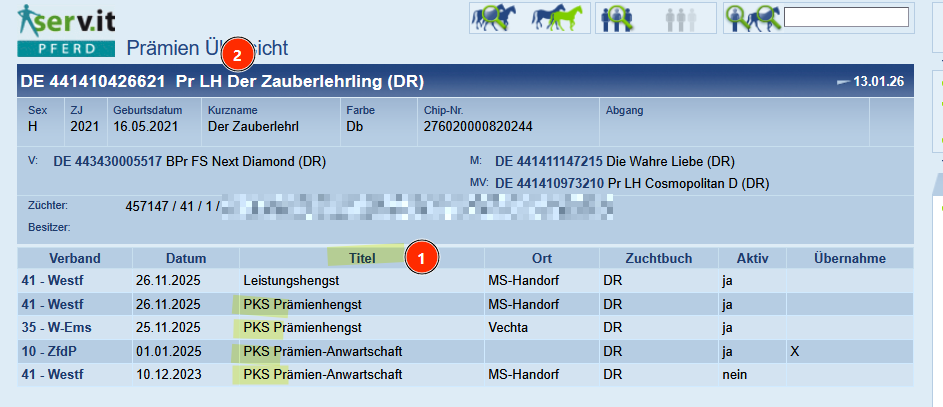 Zur Differenzierung zu den verbandsspezifischen Prämientiteln ist in der Bezeichnung der Zusatz 'PKS' geführt. Dieser wird in den Erfassungsdialogen und Sichten in serv.it PFERD angezeigt. Bei Ausgabe der Titel wird jedoch der Text (Kombi) verwendet, sodass in Dokumenten und Datenbereitstellungen der Zusatz PKS nicht ausgegeben wird.