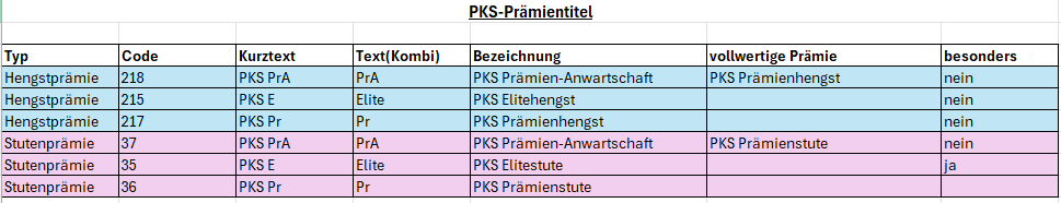 Aufgrund der Anforderungen der FN bezüglich der verbandsübergreifend gültigen Prämientitel für PKS-Rassen (siehe https://www.pferd-aktuell.de/news/aktuelle-meldungen/zucht/beirat-zucht--einheitliche-praemienvergabe-fuer-ponys-kleinpferde-und-spezialrassen) ist es notwendig geworden, bisher verbandsspezifische Prämien zu 'kopieren' in verbandsübergreifend gültige Pärmien. Diese sind fortan für alle PKS-Rassen zu verwenden, da nur diese verbandsübergreifend gültig sind.
