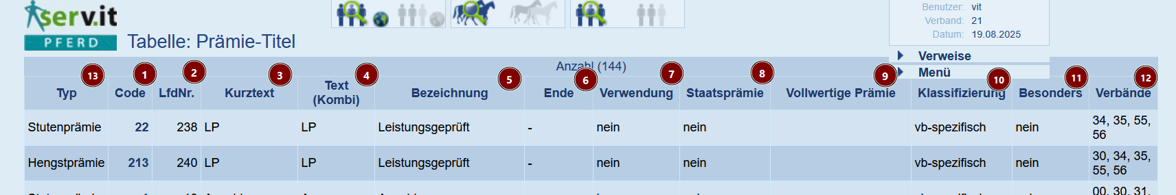 Alle Prämientitel sind in serv.it PFERD in der Tabelle 'PraemieTitel' hinterlegt: Die Prämientitel werden in der Tabelle PraemieTitel verwaltet und führen