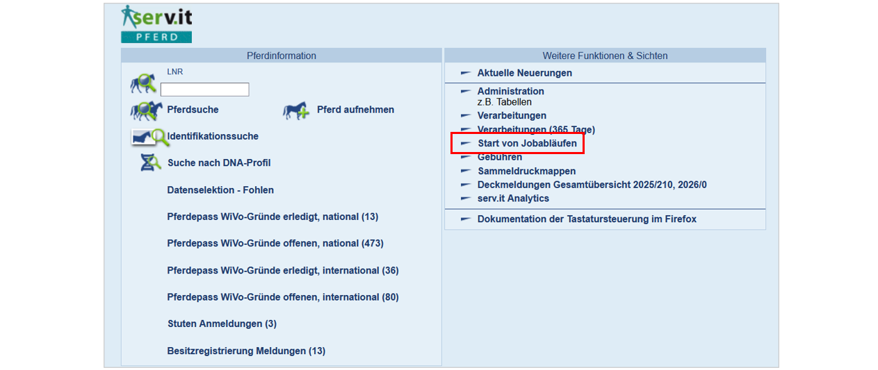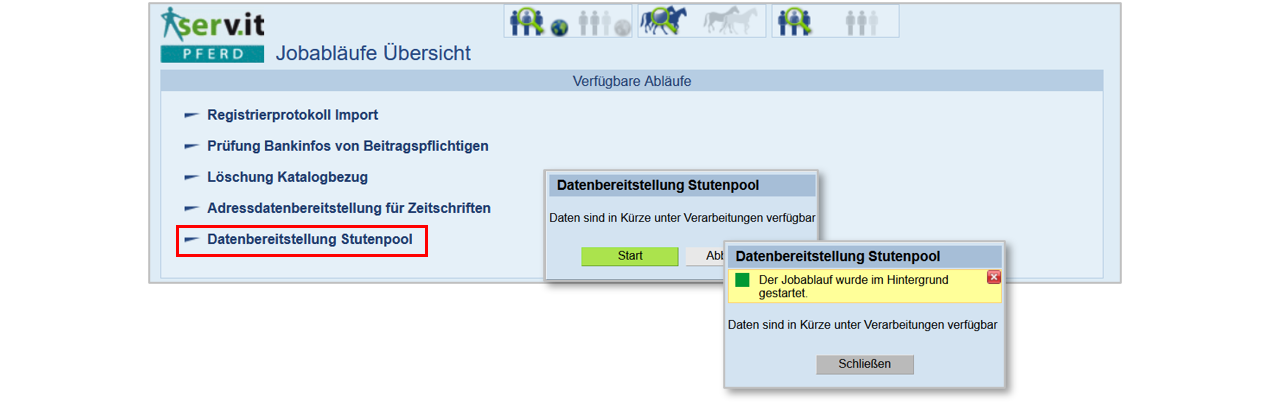 Die Erstellung des Stutenpools für externe PC-Programme der Hengsthalter ist in serv.it PFERD im Bereich „Start von Jobabläufen“ für Benutzer mit spezifischer Benutzernberechtigung möglich.
