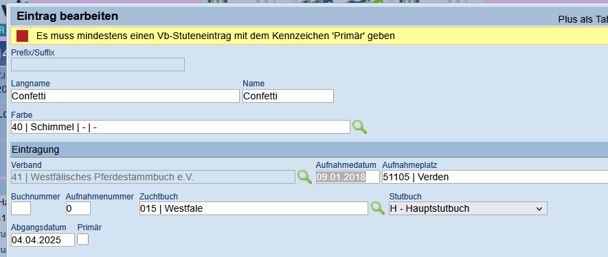 Das Kennzeichen 'Primär' definiert den für die Stute selbst relevanten vb-Stuteneintrag, wenn mehr als ein vb-Stuteneintrag vorhanden ist.