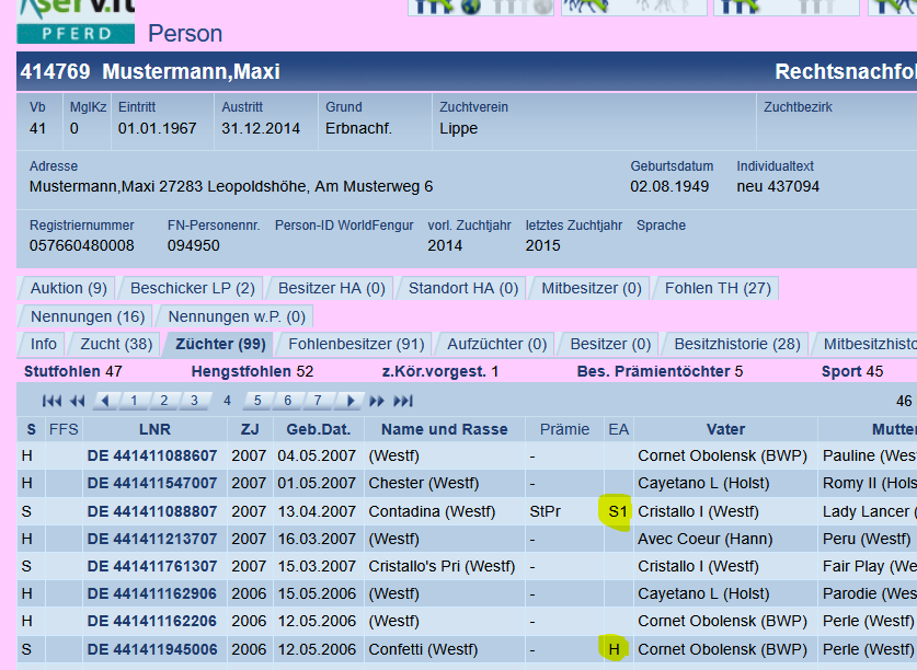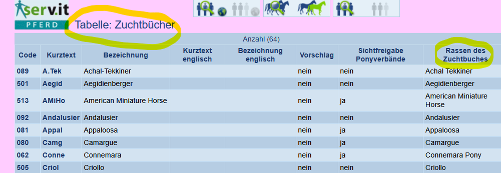 Laut Zuchtbuchordnung muss die Mutter eines Fohlens im Zuchtbuch der Rasse des Fohlens eingetragen sein. Aufgrund dessen wurden alle Zuchtbücher eines Verbandes mit der dazugehörigen Rasse verknüpft, sodass per Programm geprüft werden kann, dass diese Bedingung erfüllt ist.