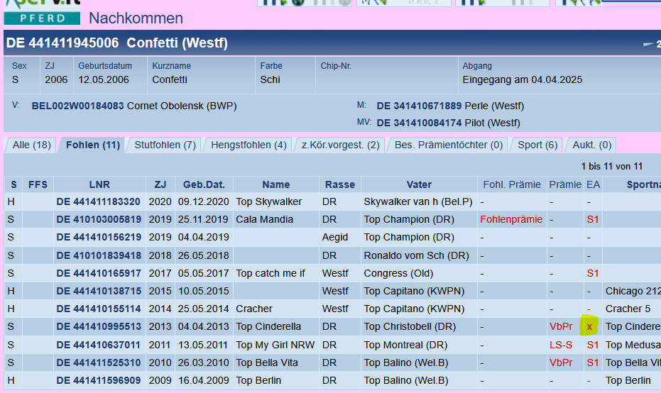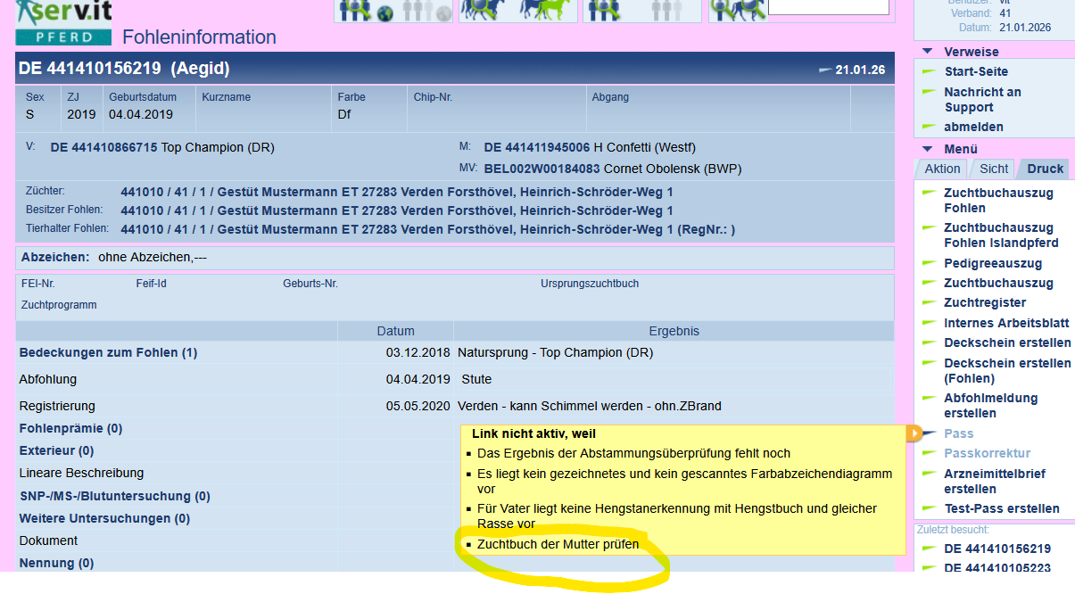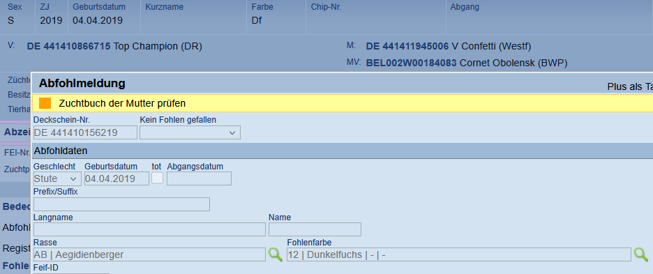 Der Passdruck ist erst dann möglich, wenn ein vb-Stuteneintrag mit dem Zuchtbuch der Rasse des Fohlens vorhanden ist: