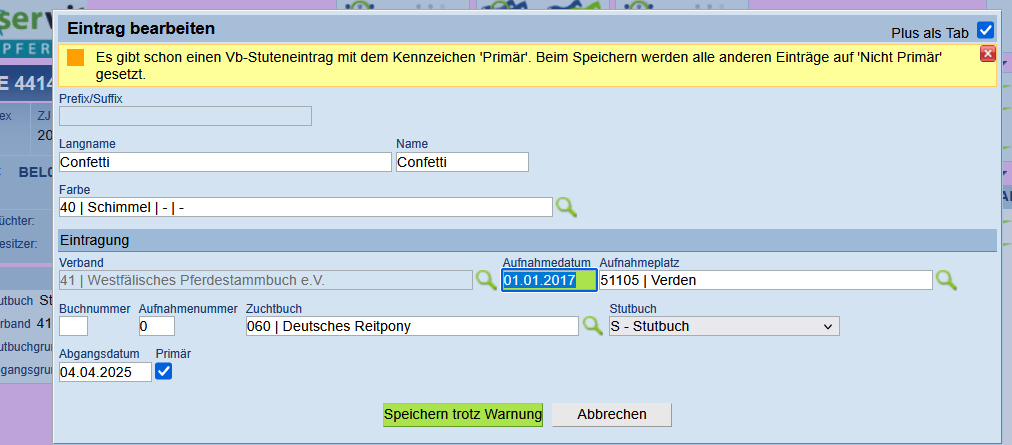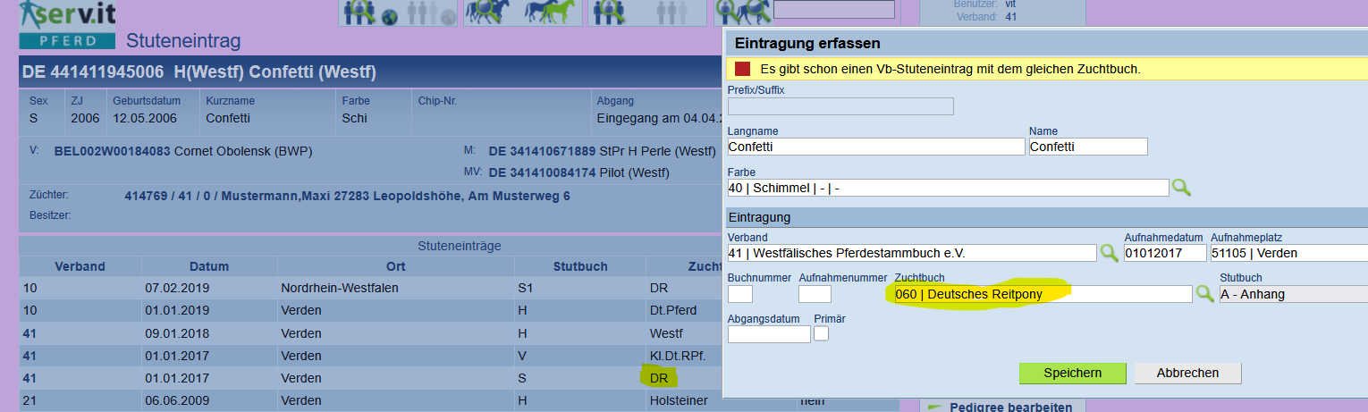 Je Verband kann es maximal einen vb-Stuteneintrag für ein Zuchtbuch geben: