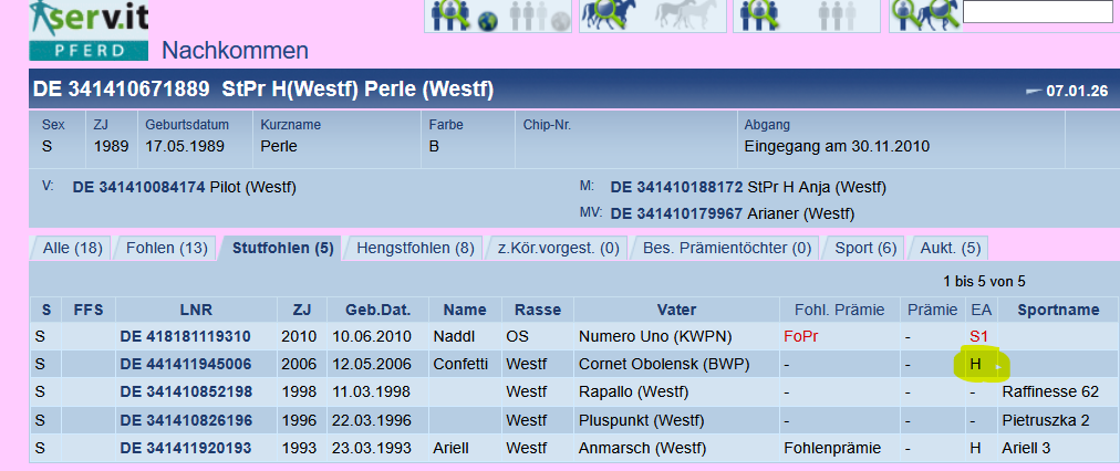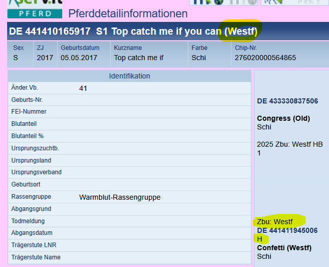 Ist keine entsprechende vb-Stutbucheintragung vorhanden, so wird nichts ausgegeben.