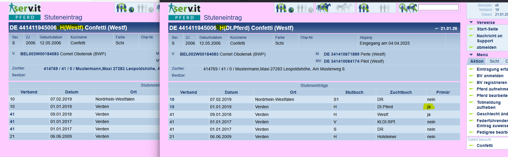 Wenn mehrere vb-Stuteneinträge vorhanden sind, dann erfolgt die Anzeige des Stutbuchs zuzüglich des Zuchtbuchs aus dem 'relevanten vb-Stuteneintrag Tier'