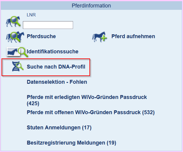 Die Suchfunktion 'Suche nach DNA-Profil' befindet sich auf der Startseite im Bereich 'Pferdinformation' unterhalb der 'Identifikationssuche'