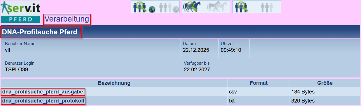 Dort finden Sie ein Protokoll mit den Suchkriterien und die Anzahl der selektierten Pferd sowie die Ergebnis-Datei. In dieser finden Sie die Tiere, deren Profil der Suchanfrage entsprechen mit Geschlecht, UELN, Zuchtjahr, Name und Rasse.
