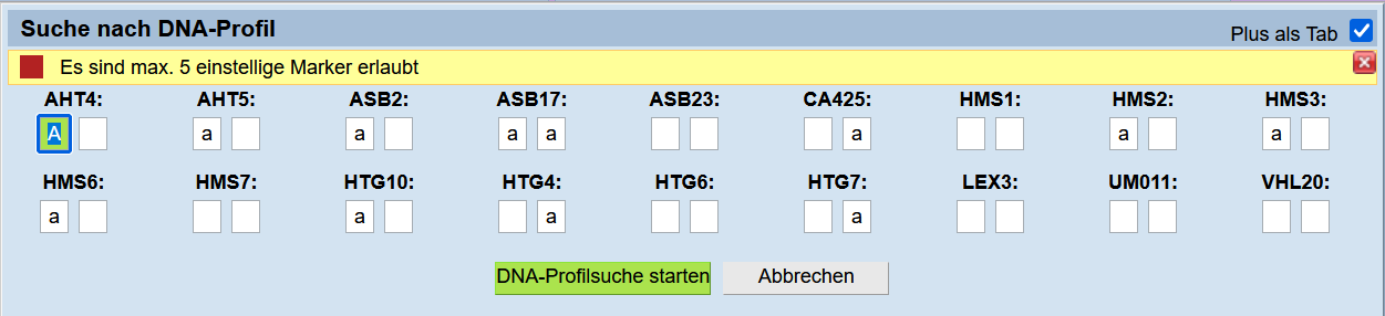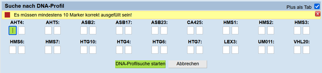 Es müssen mindestens 10 MS-Mikrosatelliten-Marker gefüllt sein. Es sind maximal 5 einstellige Marker zulässig.