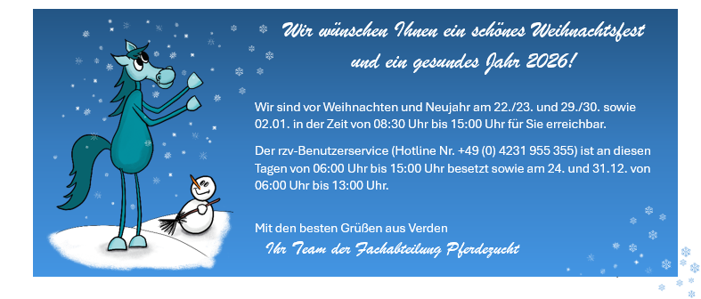 Am Dienstag, 25.03.2025 findet das Anwendertreffen 'Pferdezucht' im vit in Verden statt. Die Stutbuchführerinnen und Stutbuchführer sind herzlich eingeladen sich an diesem Tag über Neuerungen zu informieren und Erfahrungen auszutauschen.