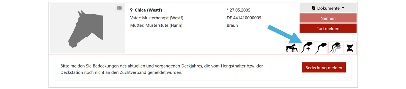Zudem ist über die Liste 'Bedeckte Stuten' die Meldung direkt von der Stute aus möglich. Im Eingabeformular muss dann die Lebensnummer der Stute nicht mehr eingegeben werden.