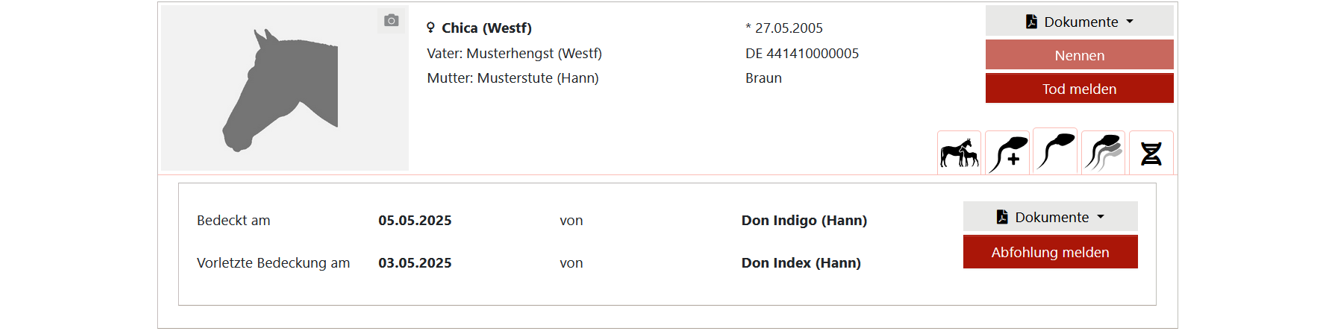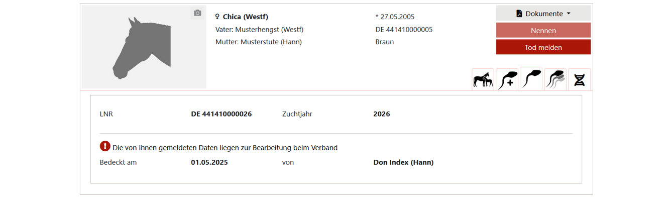 Die Bedeckungsmeldung vom WebBenutzer wird erst nach erfolgreicher Übernahme durch den Verband als Bedeckung bei der Stute angelegt.