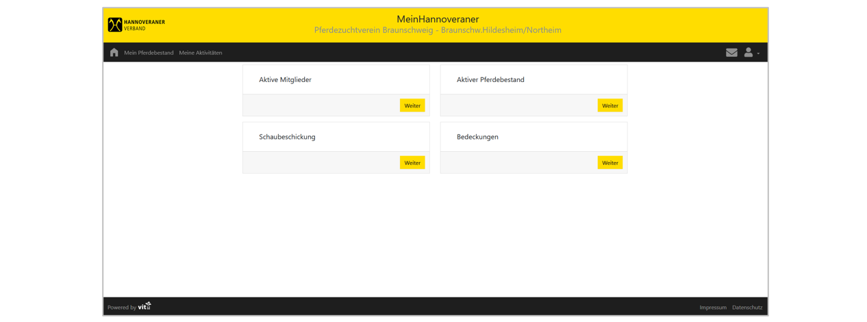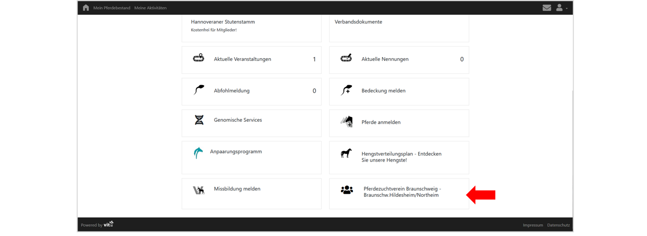 Anmeldung des PZV-Vorsitzenden mit dem in serv.it PFERD zur Person verknüpftem WebBenutzer. Auf der Startseite wird im Bereich „Meine Aktivitäten“ die Kachel „Pferdezuchtverein“ mit der Bezeichnung des Zuchtbezirks und des Zuchtvereins angezeigt: