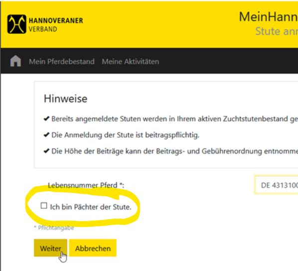 Zudem hat der WebBenutzer hier die Möglichkeit dem Verband mitzuteilen, dass er der Pächter der Stute ist. Diese Information wird dann bei der Verarbeitung des Besitzverhältnisses in serv.it PFERD berücksichtigt und das Kennzeichen 'Pachtpferd = ja ' gespeichert.